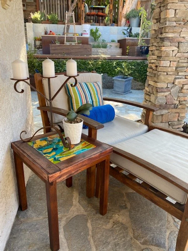 "Having Sarah make us an outdoor table was such an easy and satisfying process. She asked if we had specific colors in mind, so I mentioned an outdoor pillow that we liked. She asked to use the pillow as a color guide, which worked beautifully. She matched the colors so perfectly! Those colors, along with so much interesting and playful movement in the paint, resulted in an extraordinary art piece for our garden."